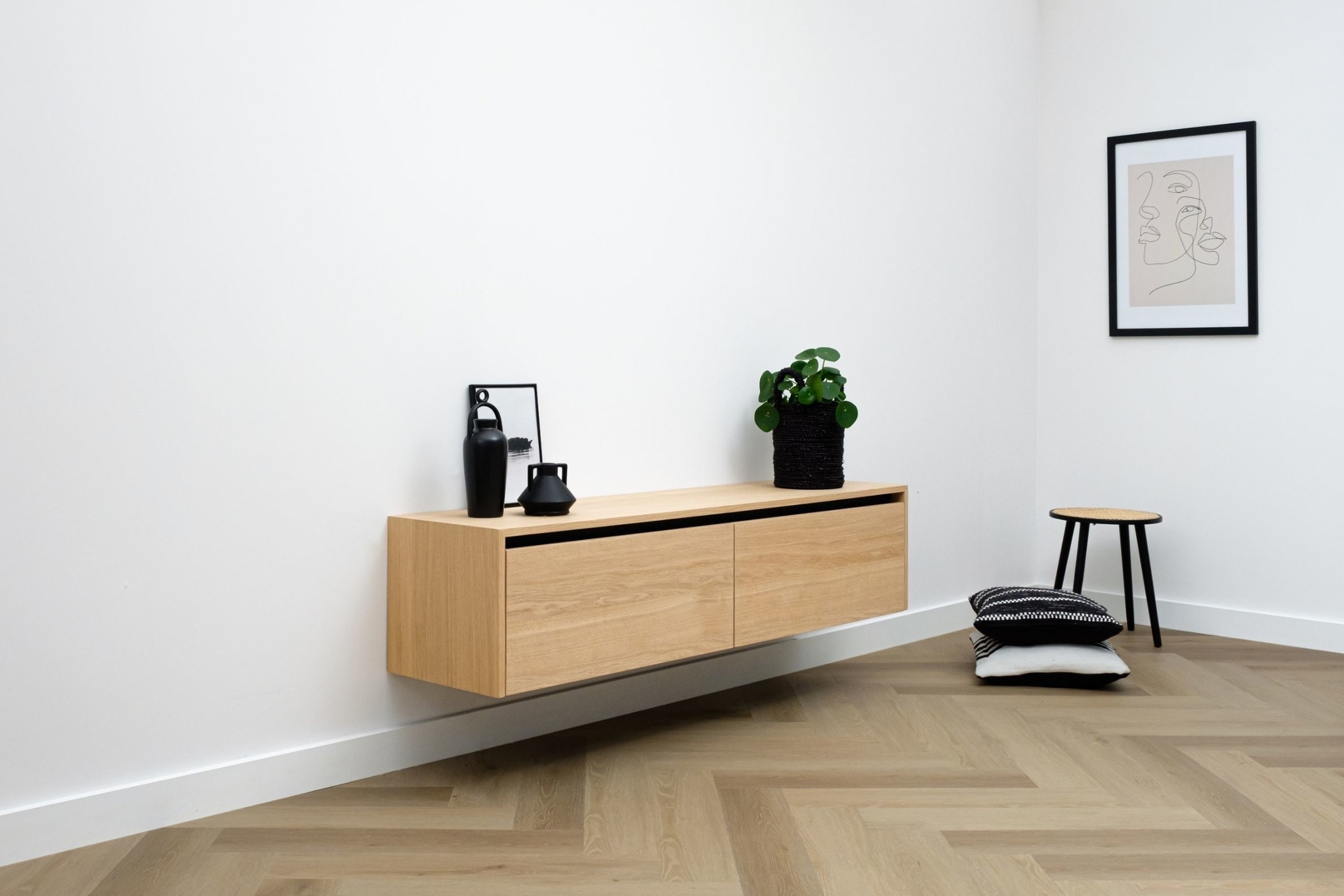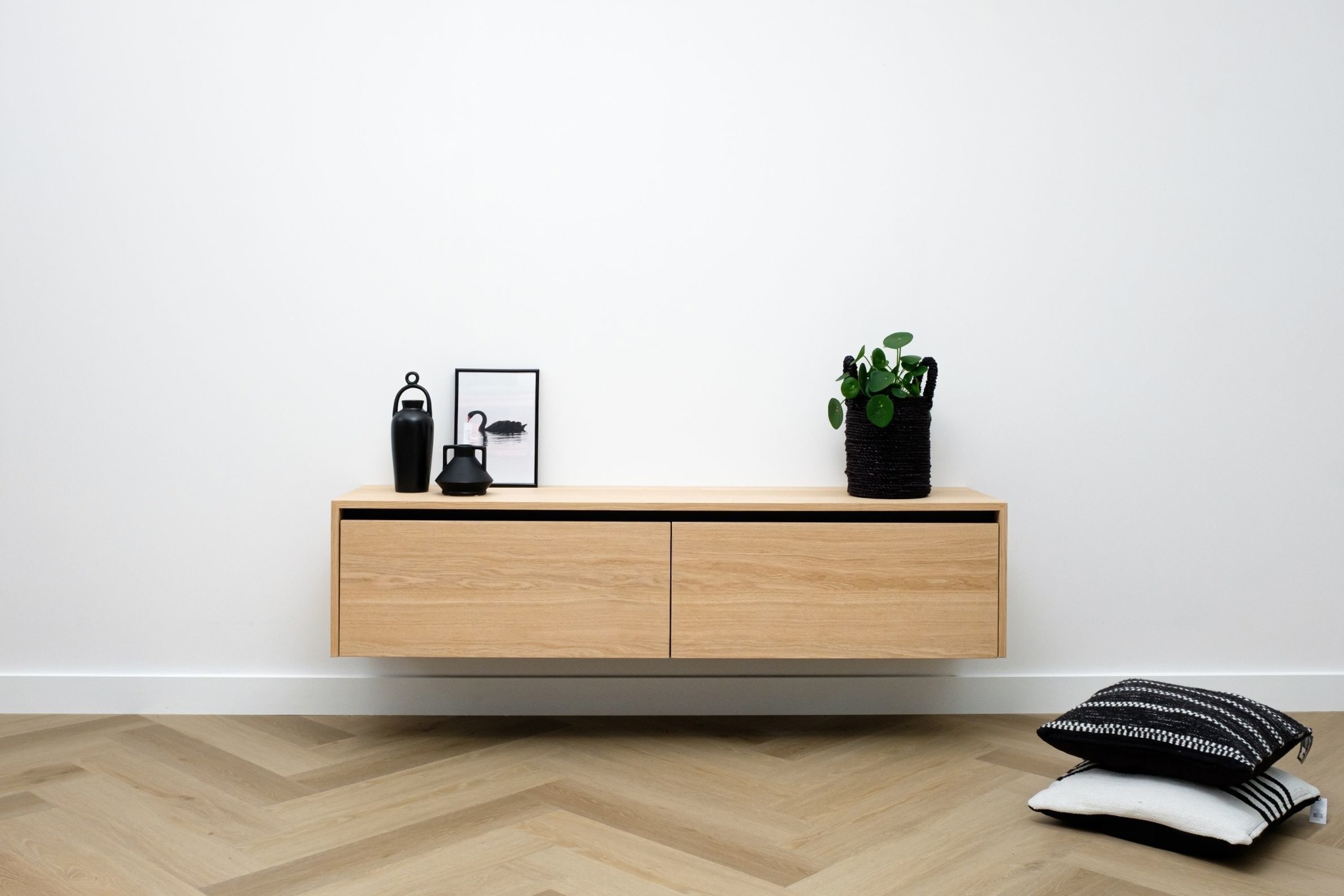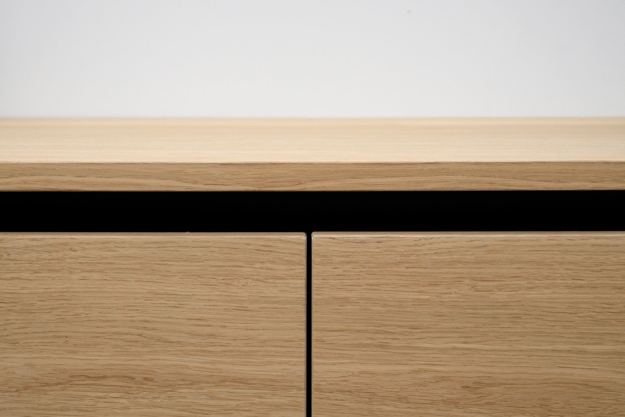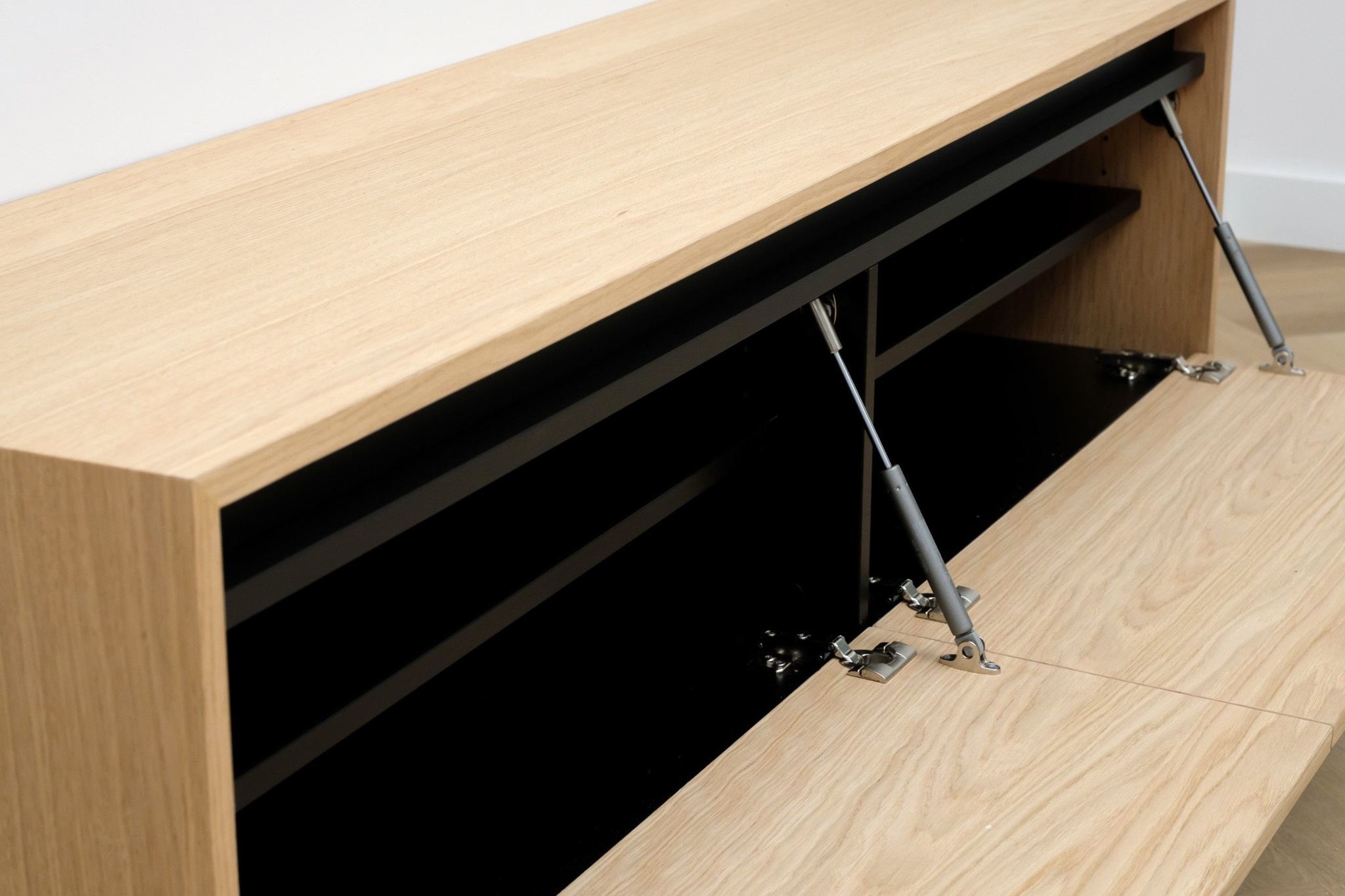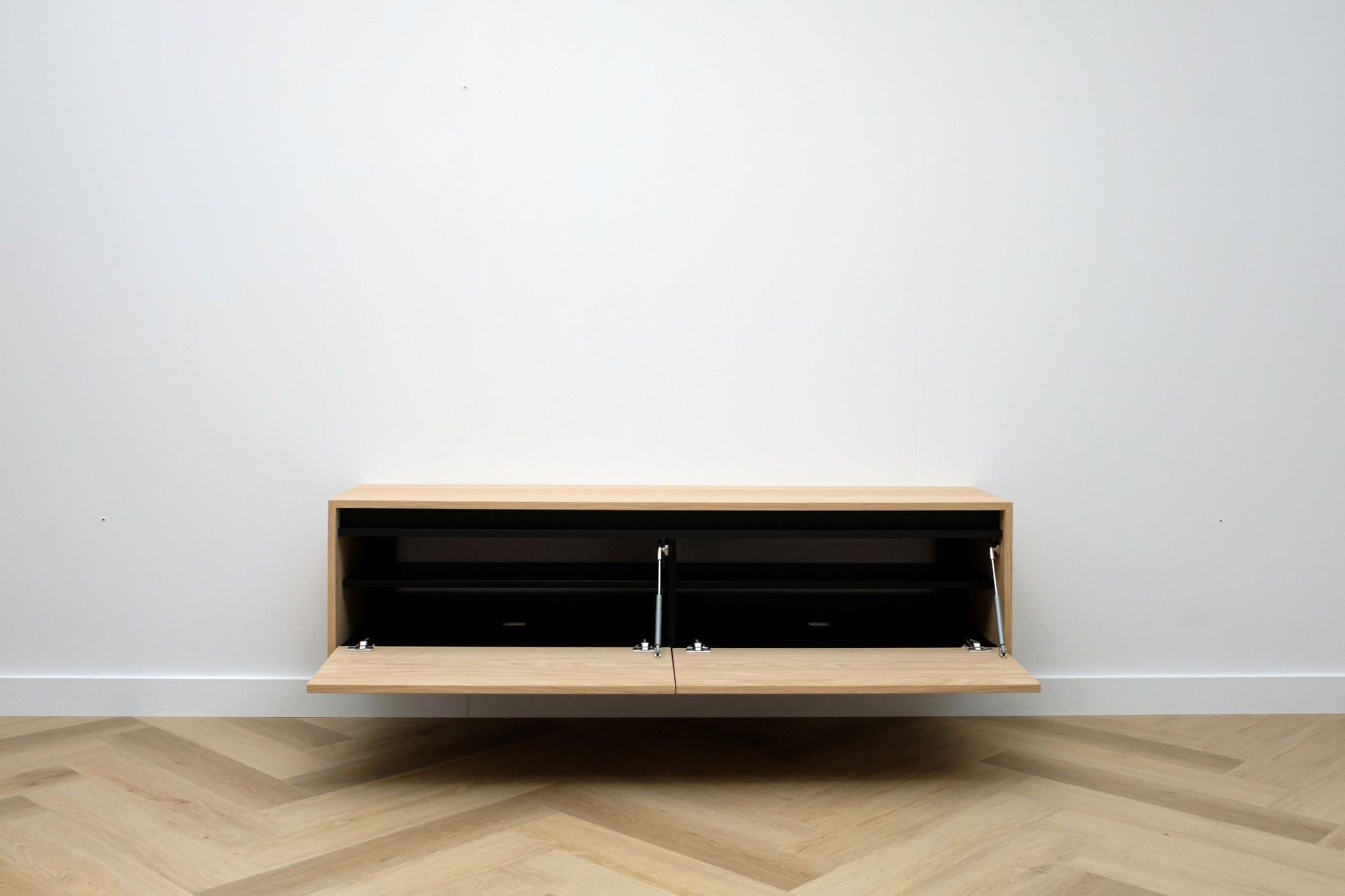 Zwevend tv meubel met 2 kleppen en greeplijst in eiken fineer gelakt