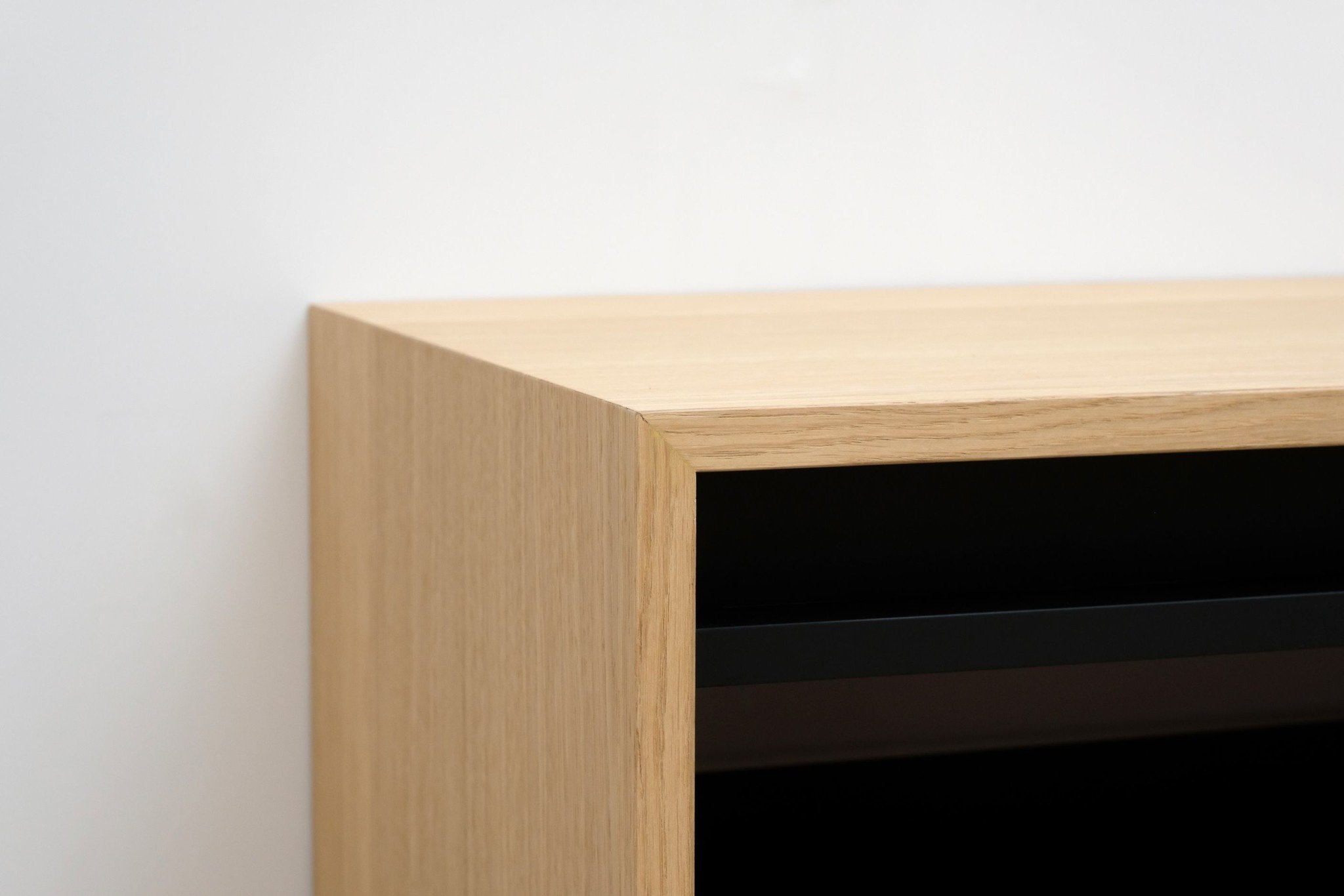 De uitvoering is volledig naadloos in verstek en is gemaakt van eikenhoutfineer en mat afgelakt. Op verzoek is het meubel ook in andere houttonen te lakken.