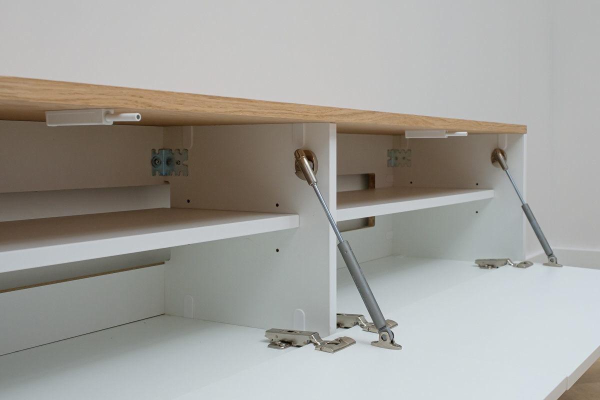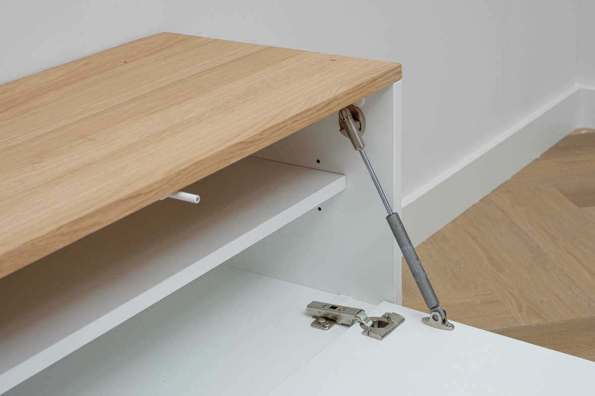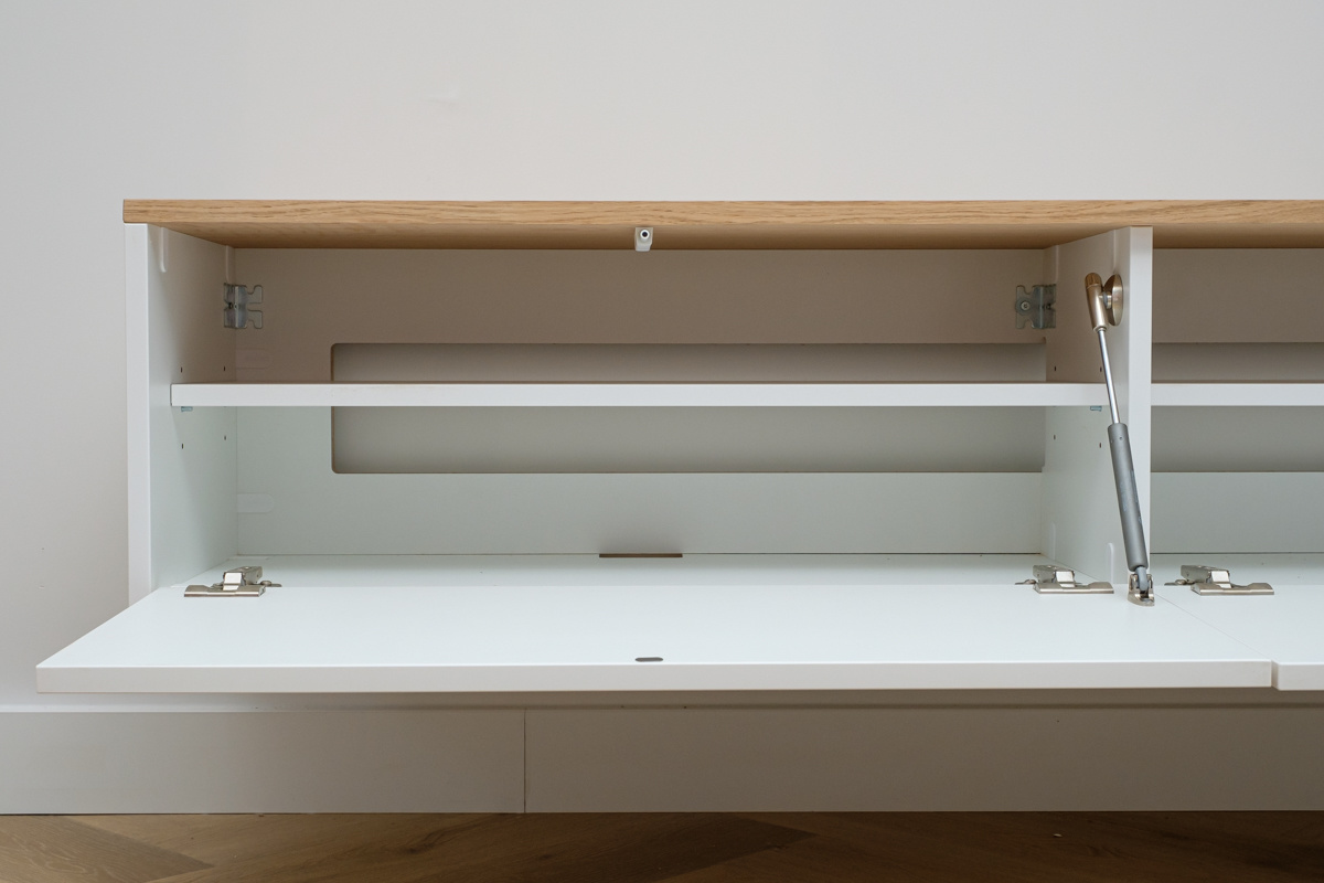 Het Tv meubel is greeploos uitgevoerd en voorzien van 2 valkleppen. Met het “push-to-open†systeem en de hoogwaardige gasveren openen de kleppen heel rustig door een simpele duw tegen het front.