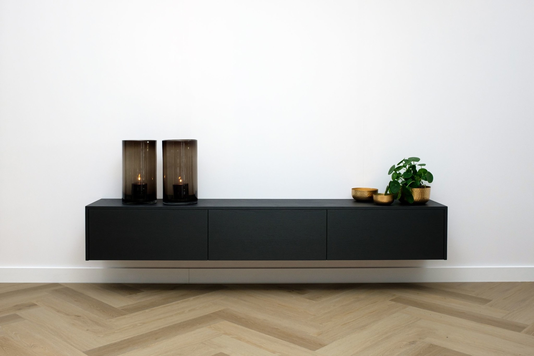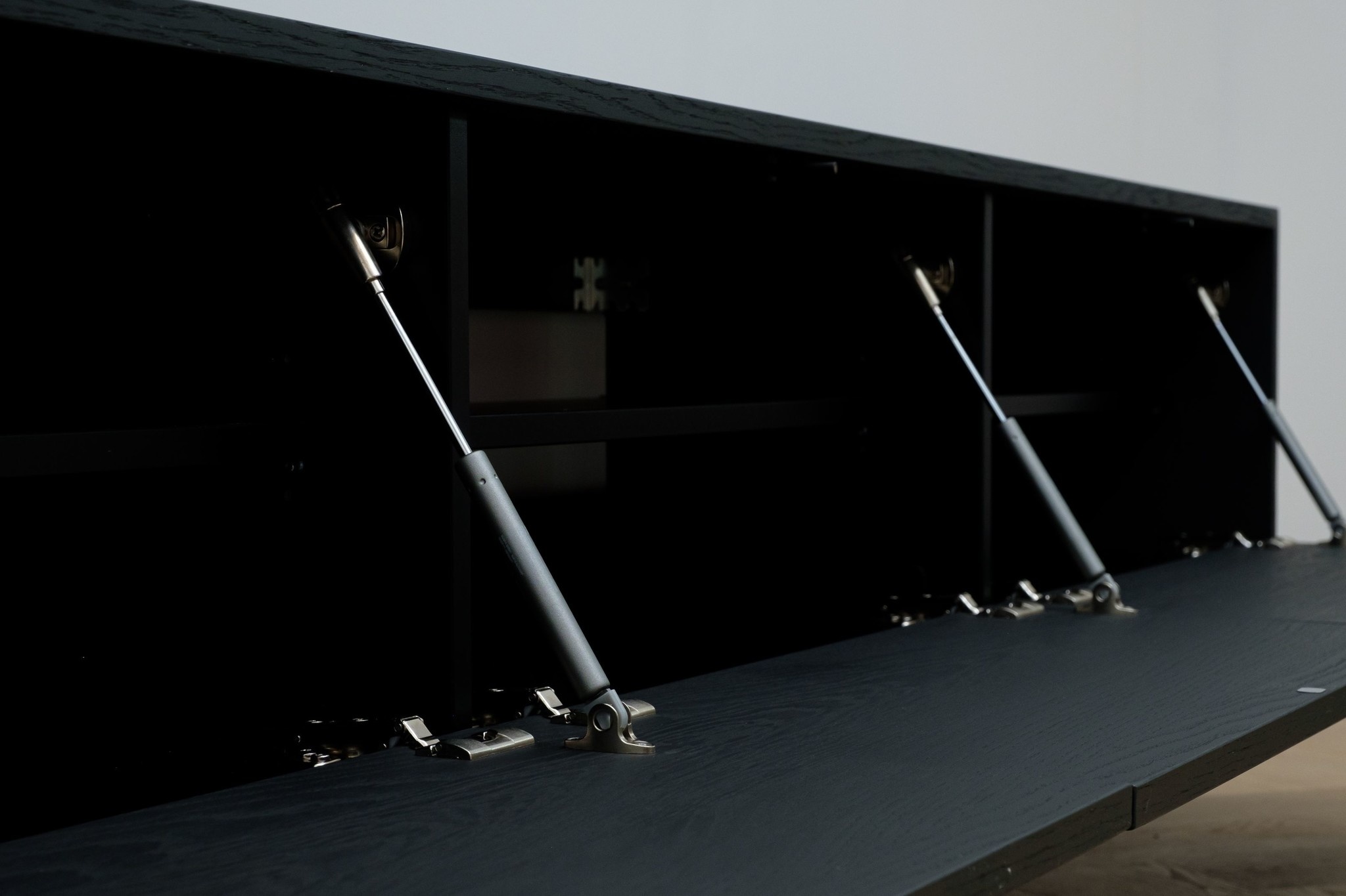 Het Tv meubel is greeploos uitgevoerd en voorzien van 3 valkleppen. Met het “push-to-open” systeem en de hoogwaardige gasveren openen de kleppen heel rustig door een simpele duw tegen het front.