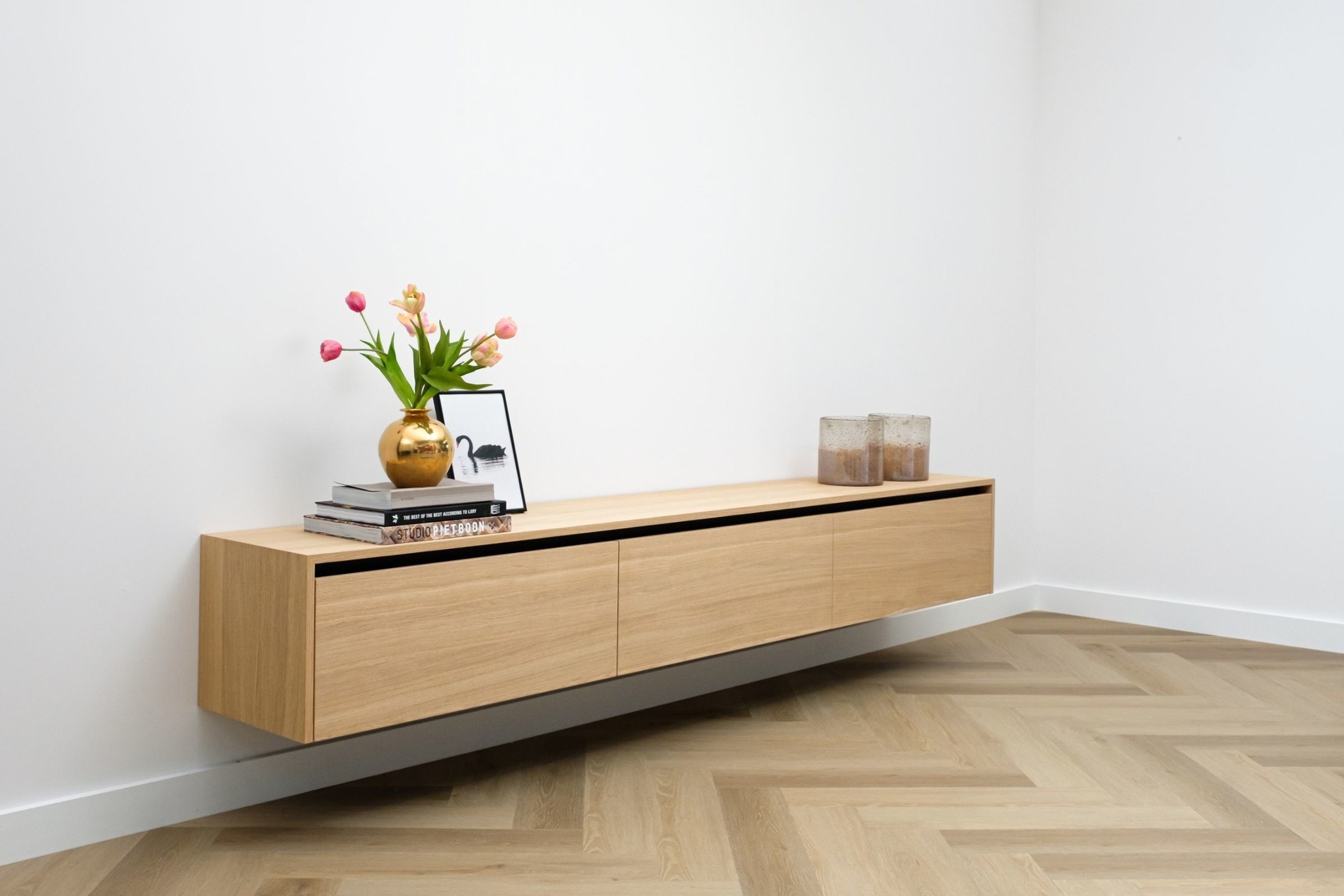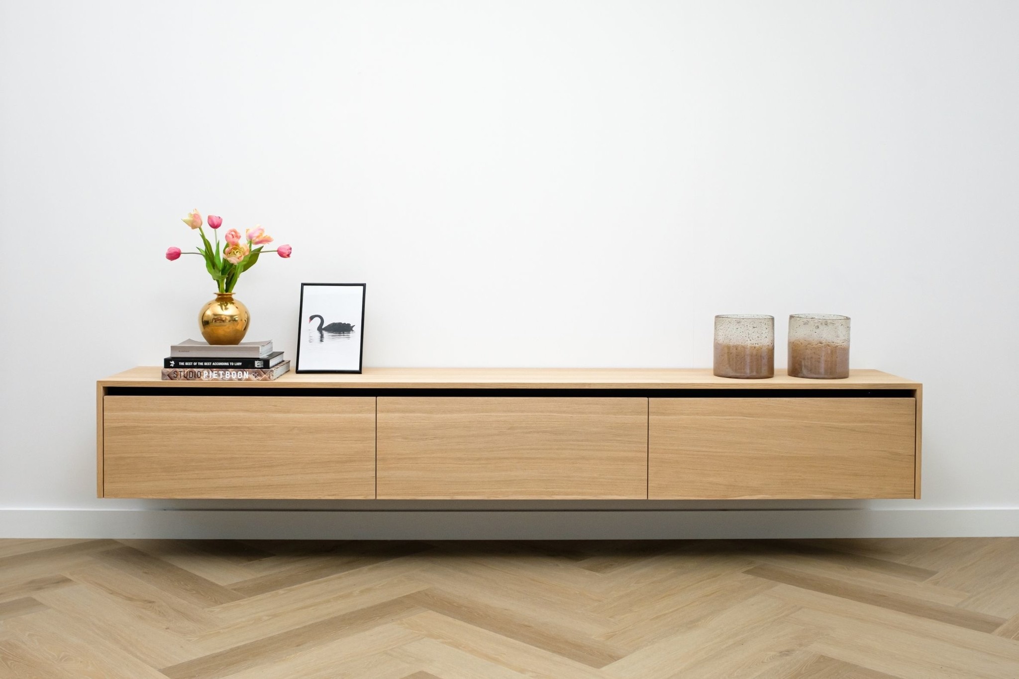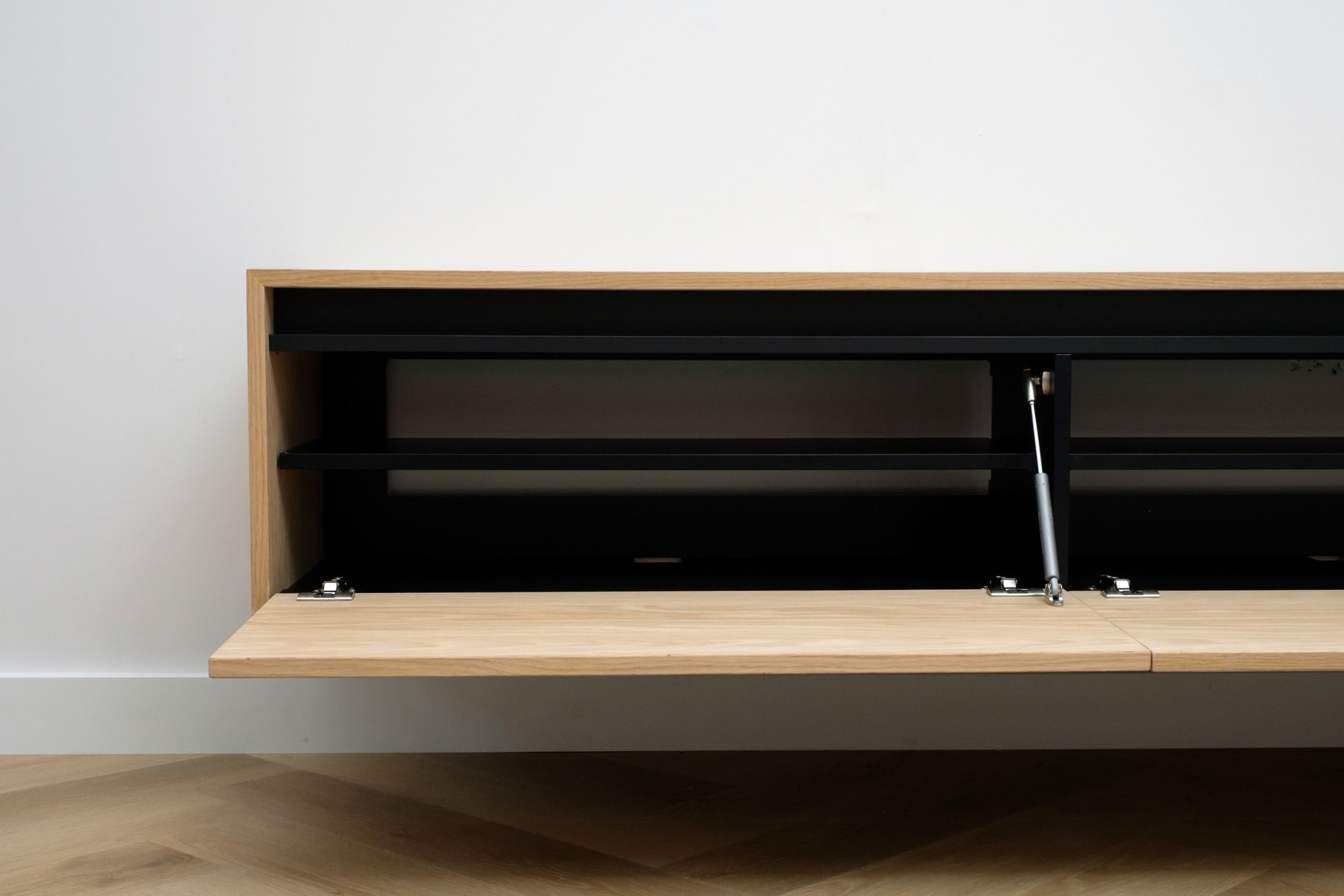 Zwevend tv meubel met 3 kleppen en greeplijst in eiken fineer gelakt