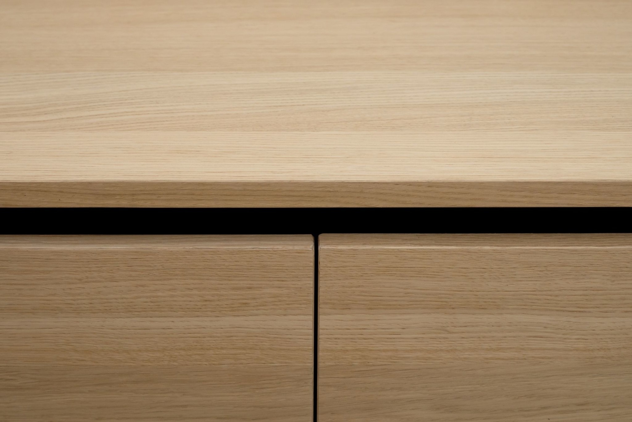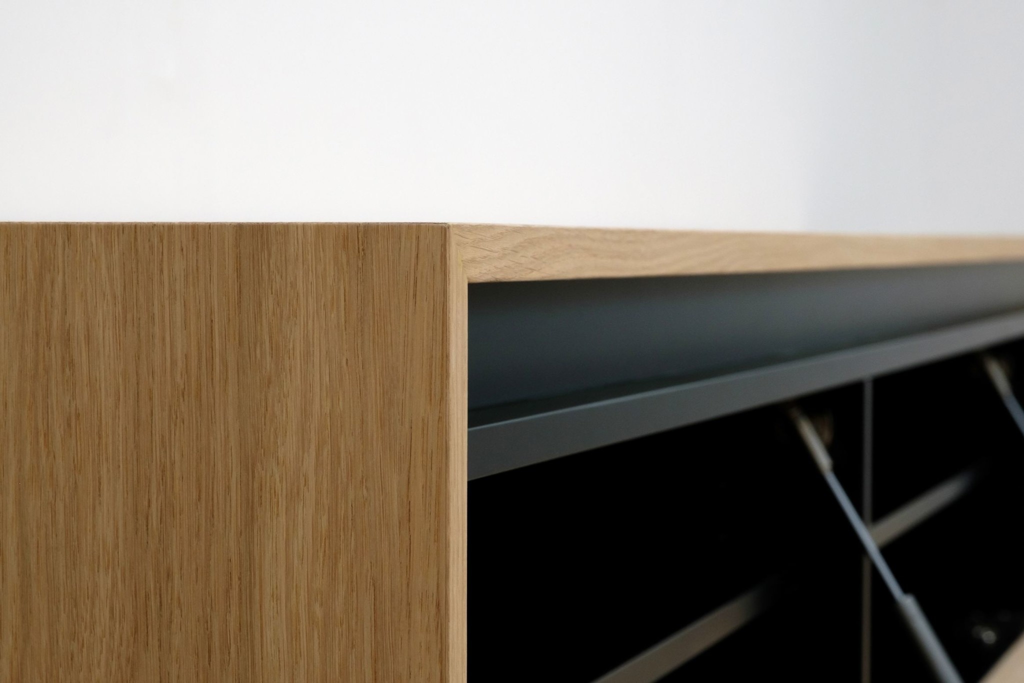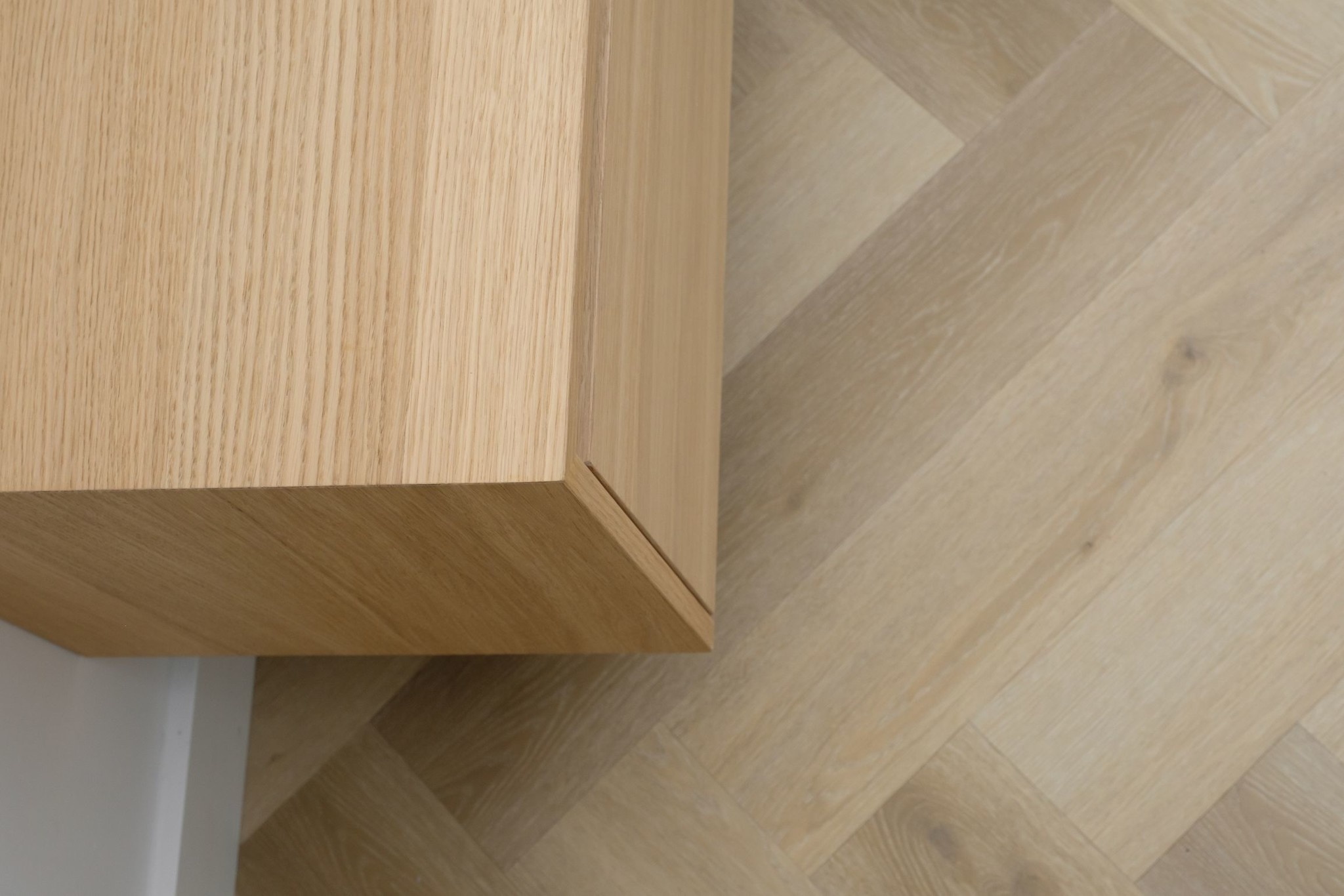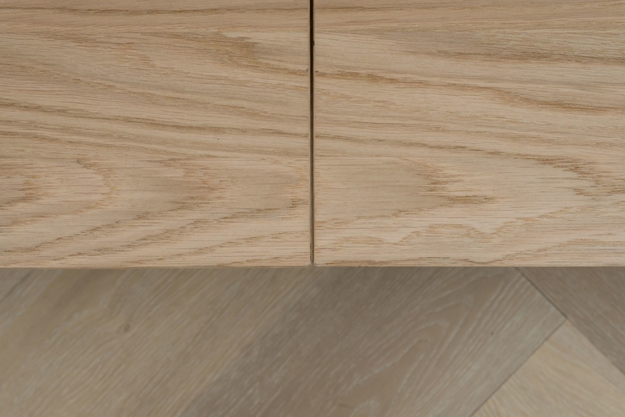 De uitvoering is volledig naadloos in verstek en is gemaakt van eikenhoutfineer en mat afgelakt. Op verzoek is het meubel ook in andere houttonen te lakken.