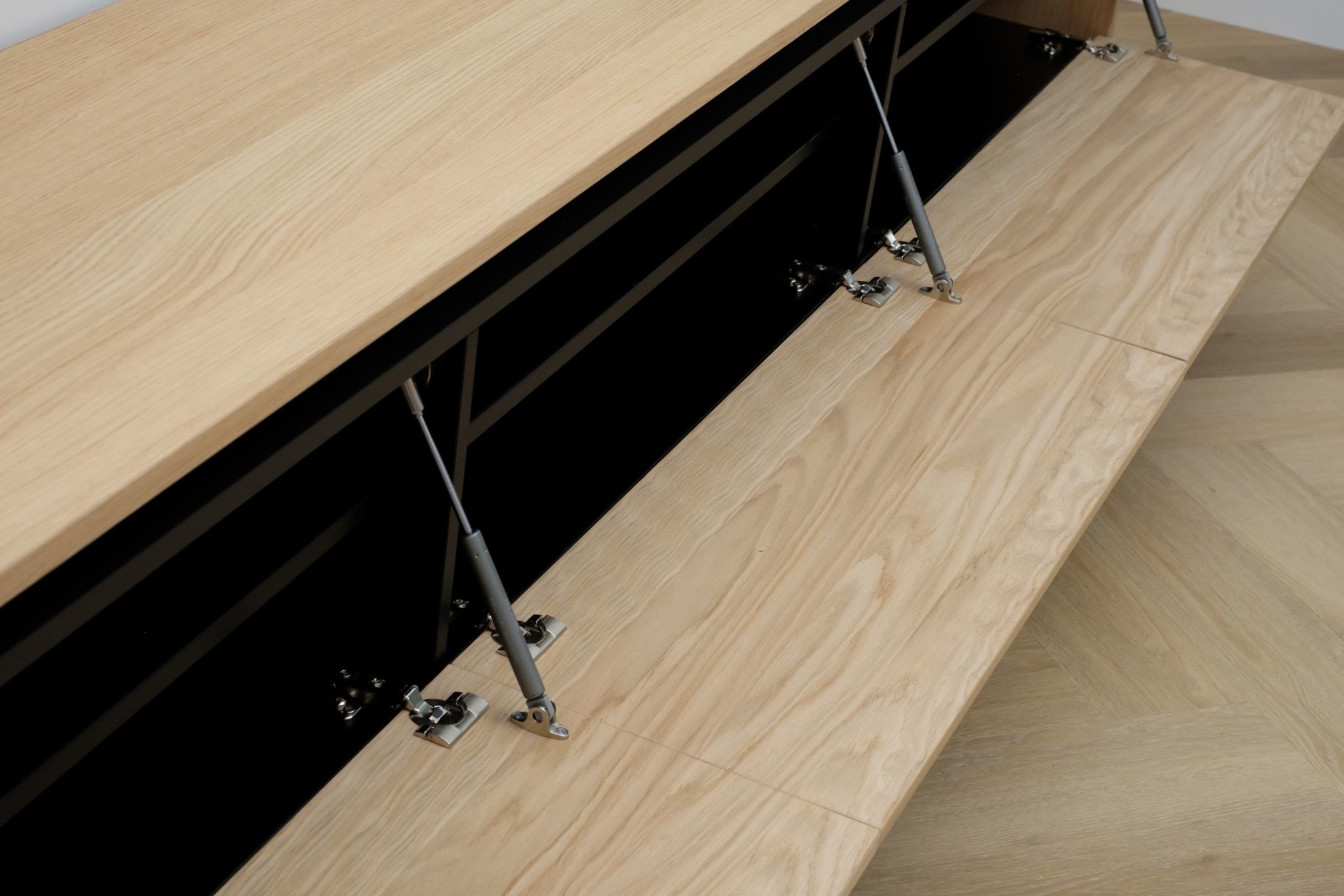 Het Tv meubel is uitgevoerd met greeplijst en voorzien van 3 valkleppen. Met het “push-to-open” systeem en de hoogwaardige gasveren openen de kleppen heel rustig door een simpele duw tegen het front.