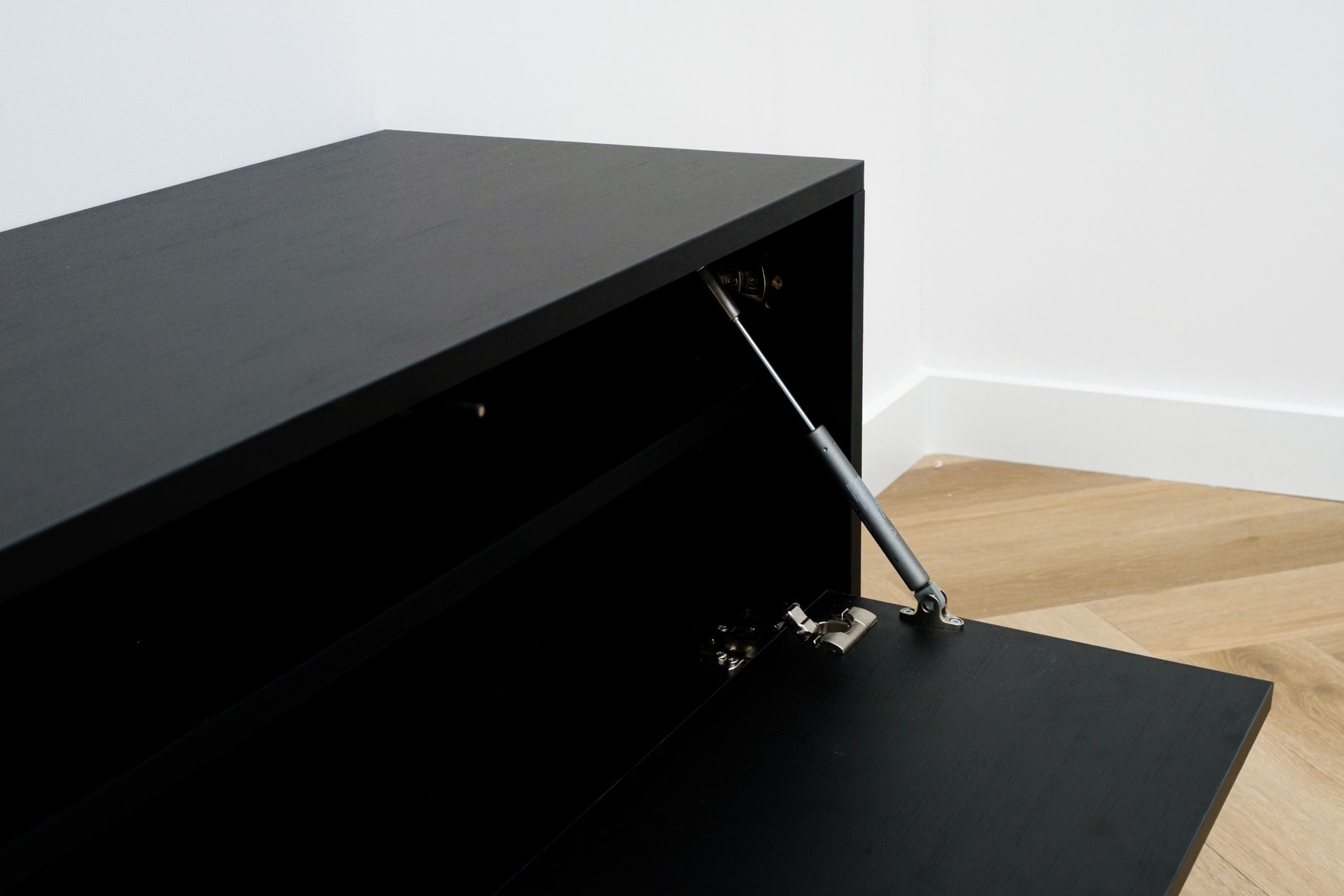 Het Tv meubel is greeploos uitgevoerd en voorzien van 2 valkleppen. Met het “push-to-open†systeem en de hoogwaardige gasveren openen de kleppen heel rustig door een simpele duw tegen het front.